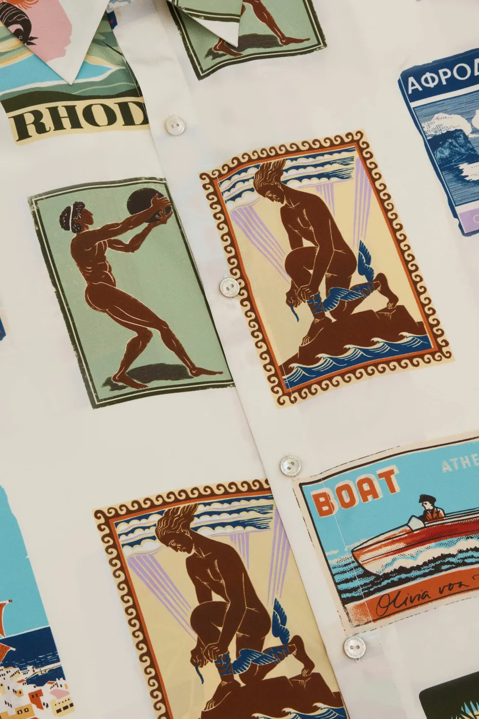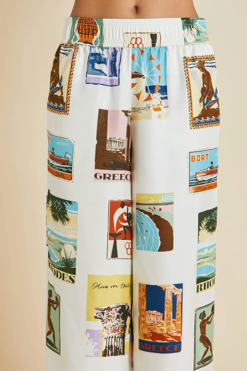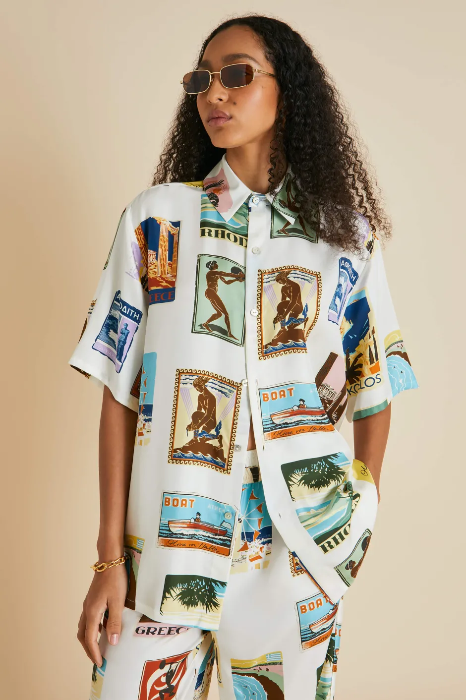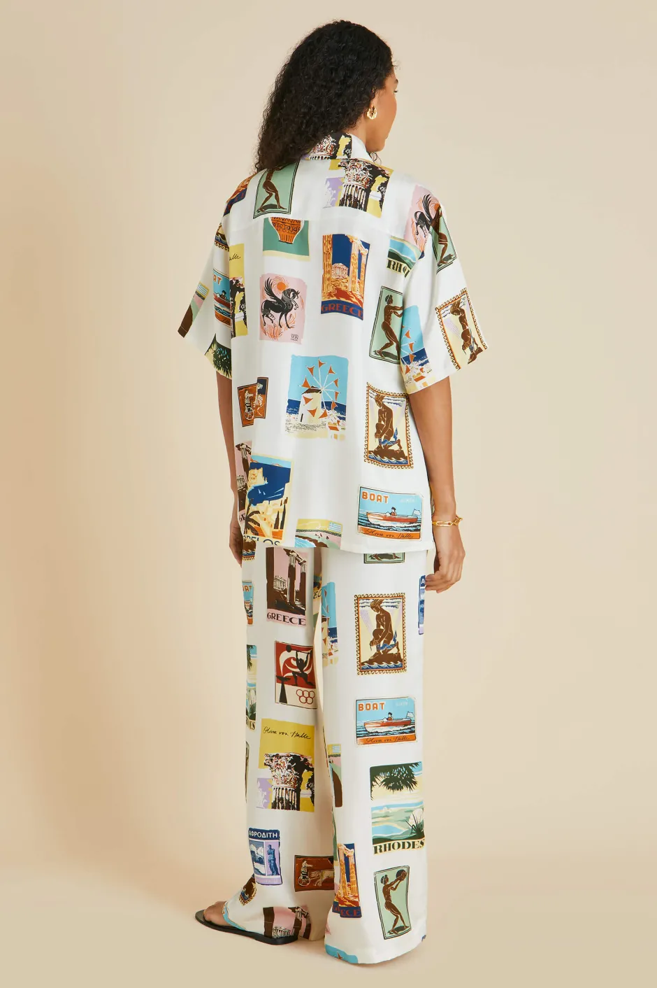 In our Alabama set, you’ll be the talk of the resort. Inspired by the enchanting designs of 1950s vintage postcards and paying homage to the sun-soaked pleasures of Greece, this ivory silk twill shirt and palazzo trouser set melds old school glamour with contemporary charm. With its relaxed fit and playful patterning, it’s an instant holiday classic.