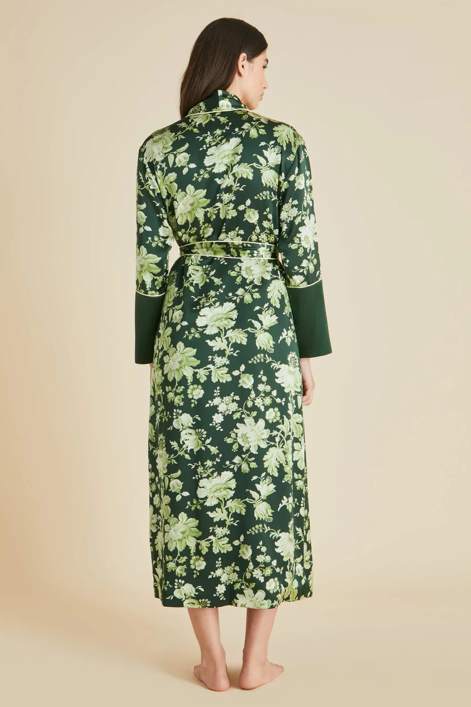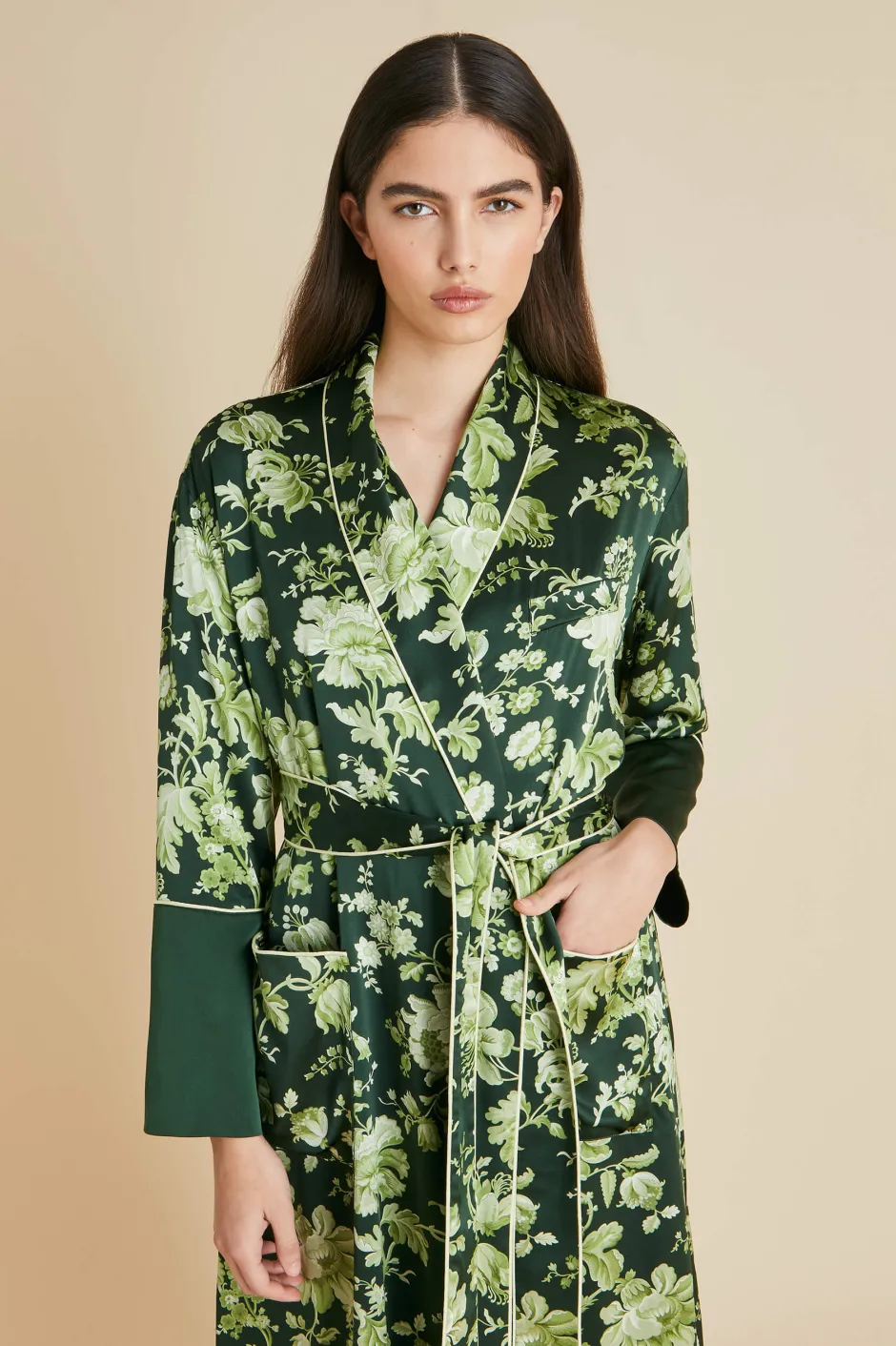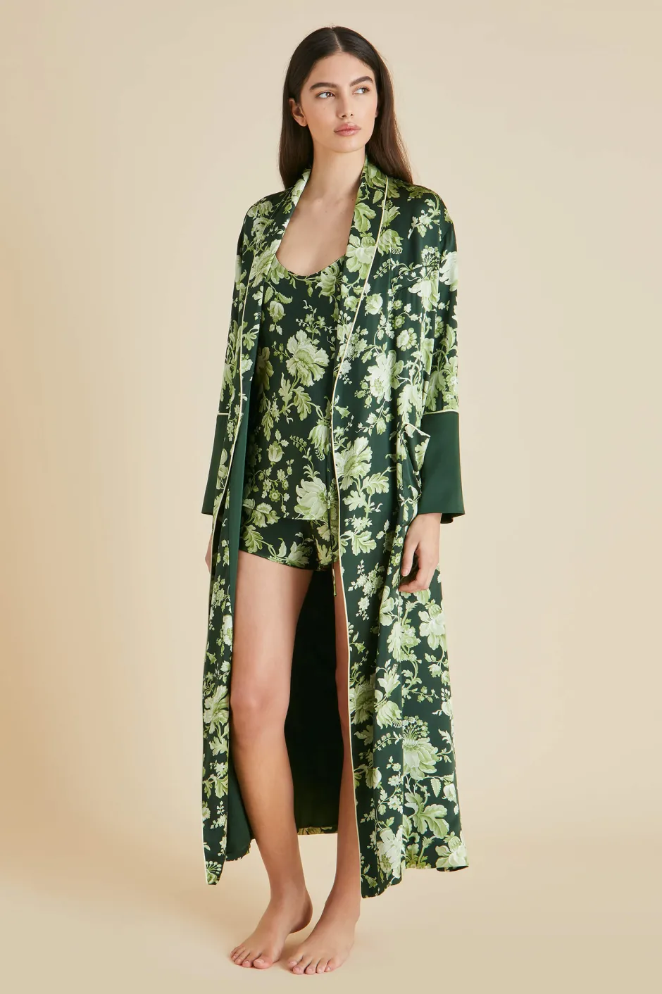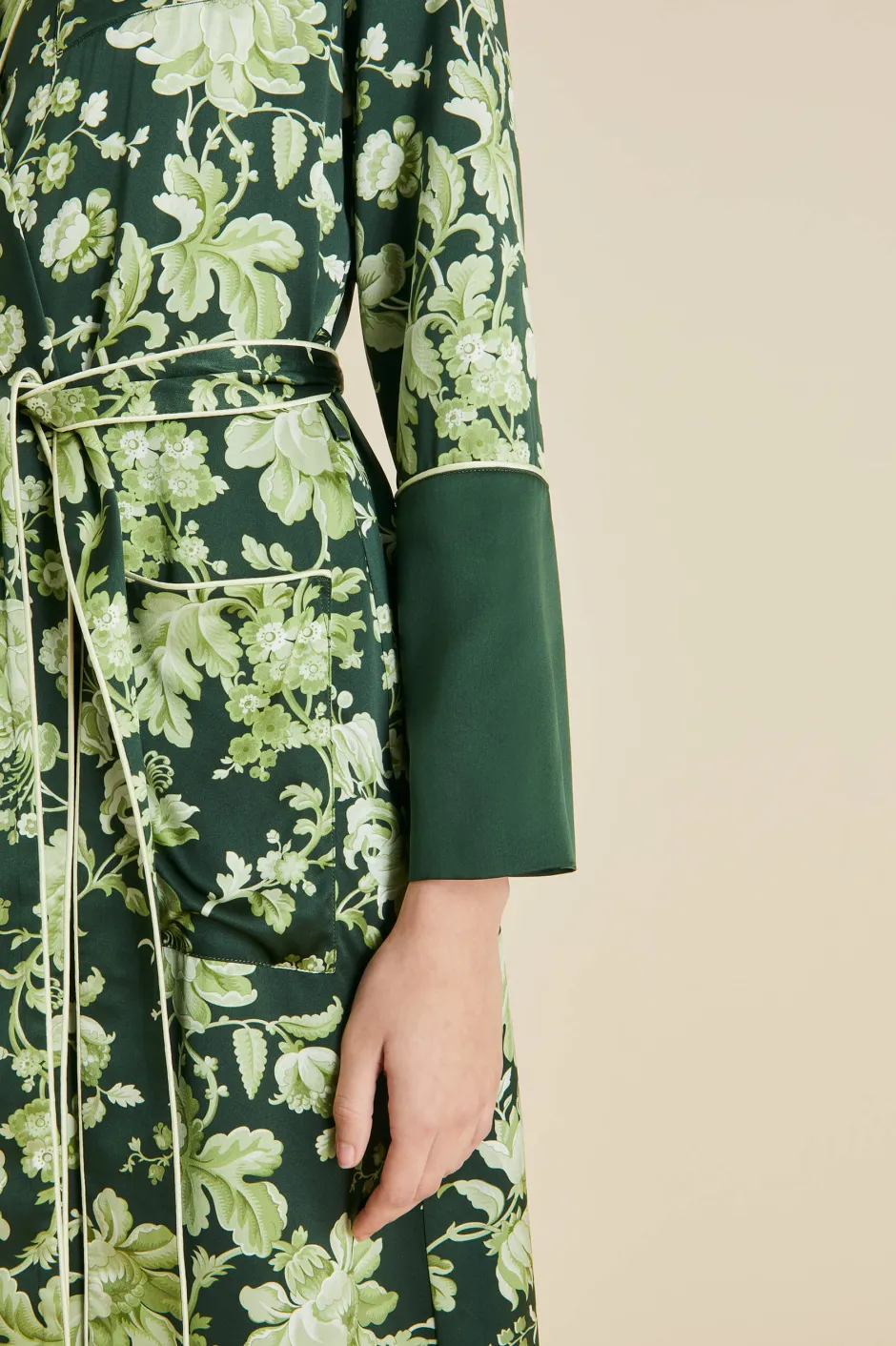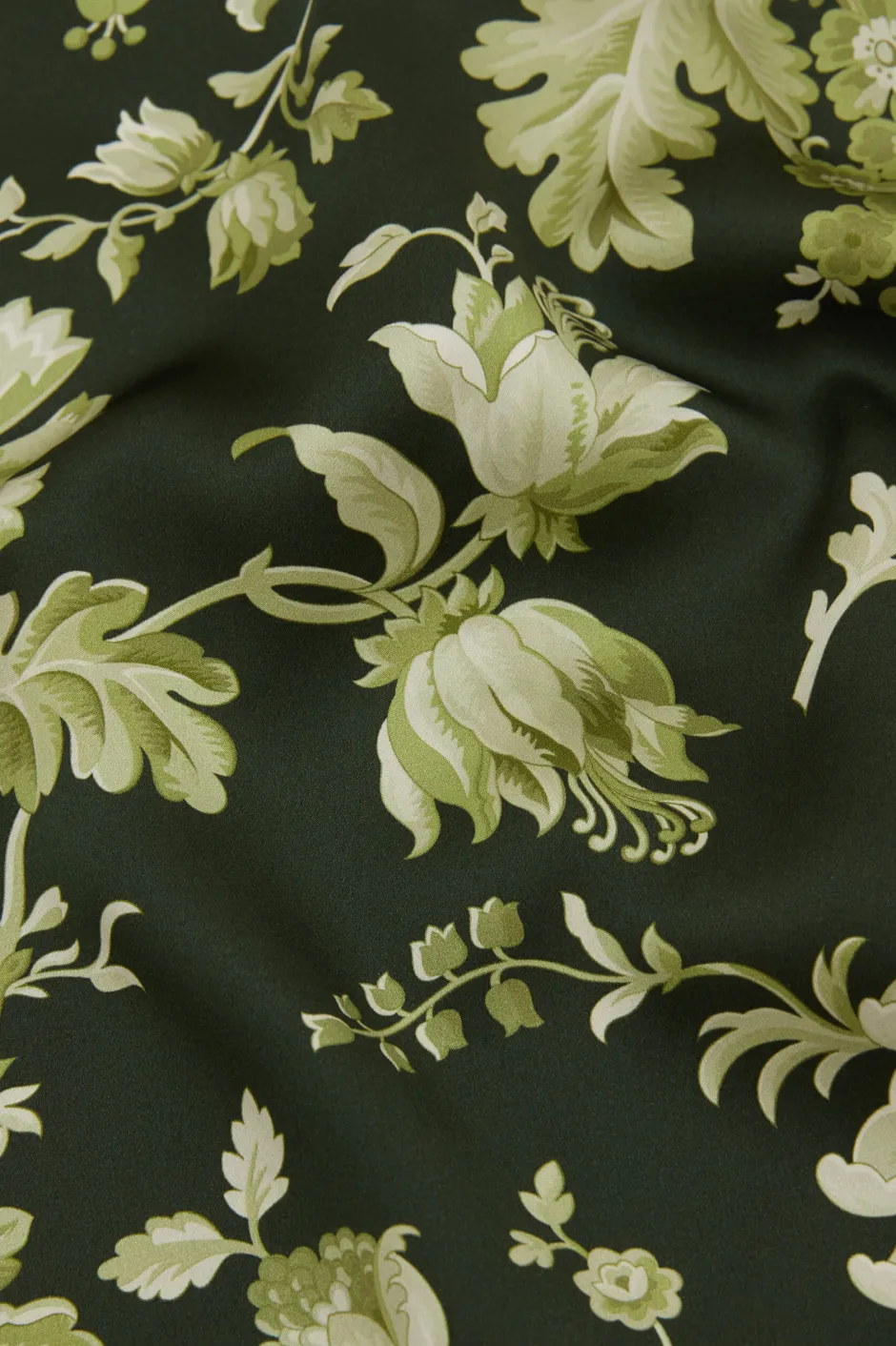 Find your inner (and outer) goddess in our iconic Capability robe. Featuring leaf green florals twined across luxurious silk satin, this vivacious pattern is a maximalist’s dream: rich, resplendent, and reminiscent of a mythic garden after dark, when the scent of the flowers is strongest. Screen-printed for maximum saturation and detail, this piece will inspire only the most luxurious lounging.