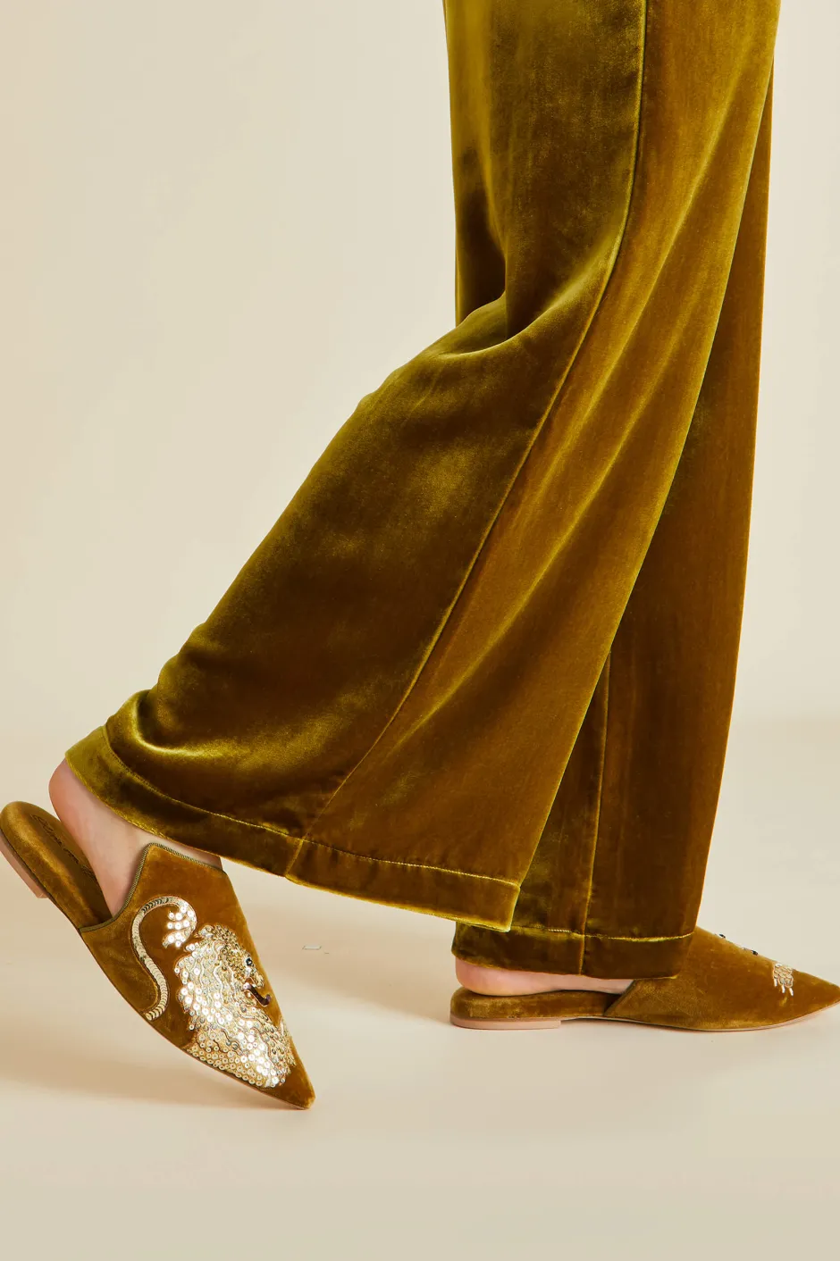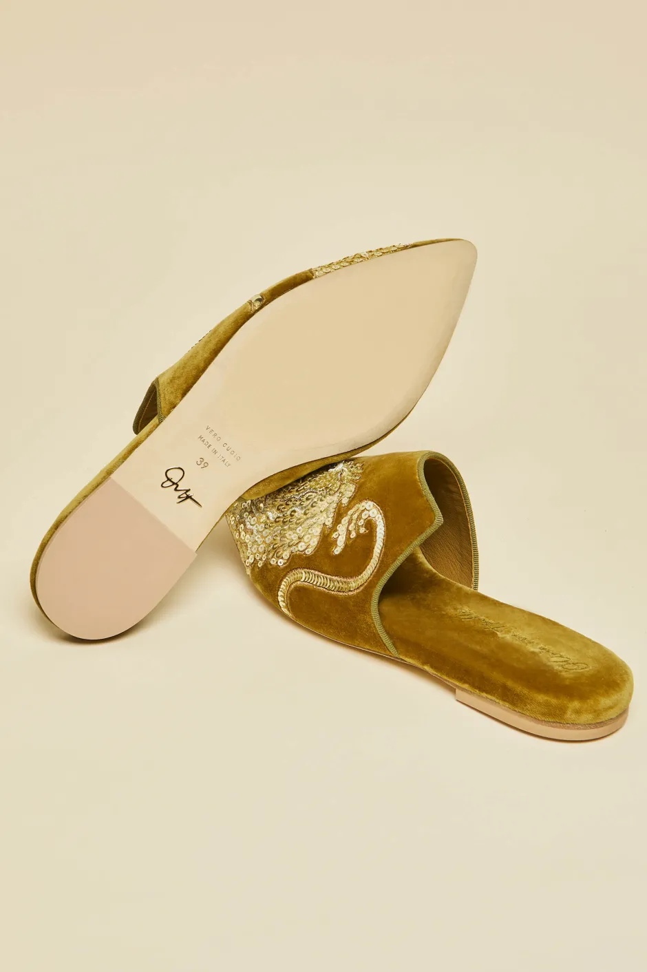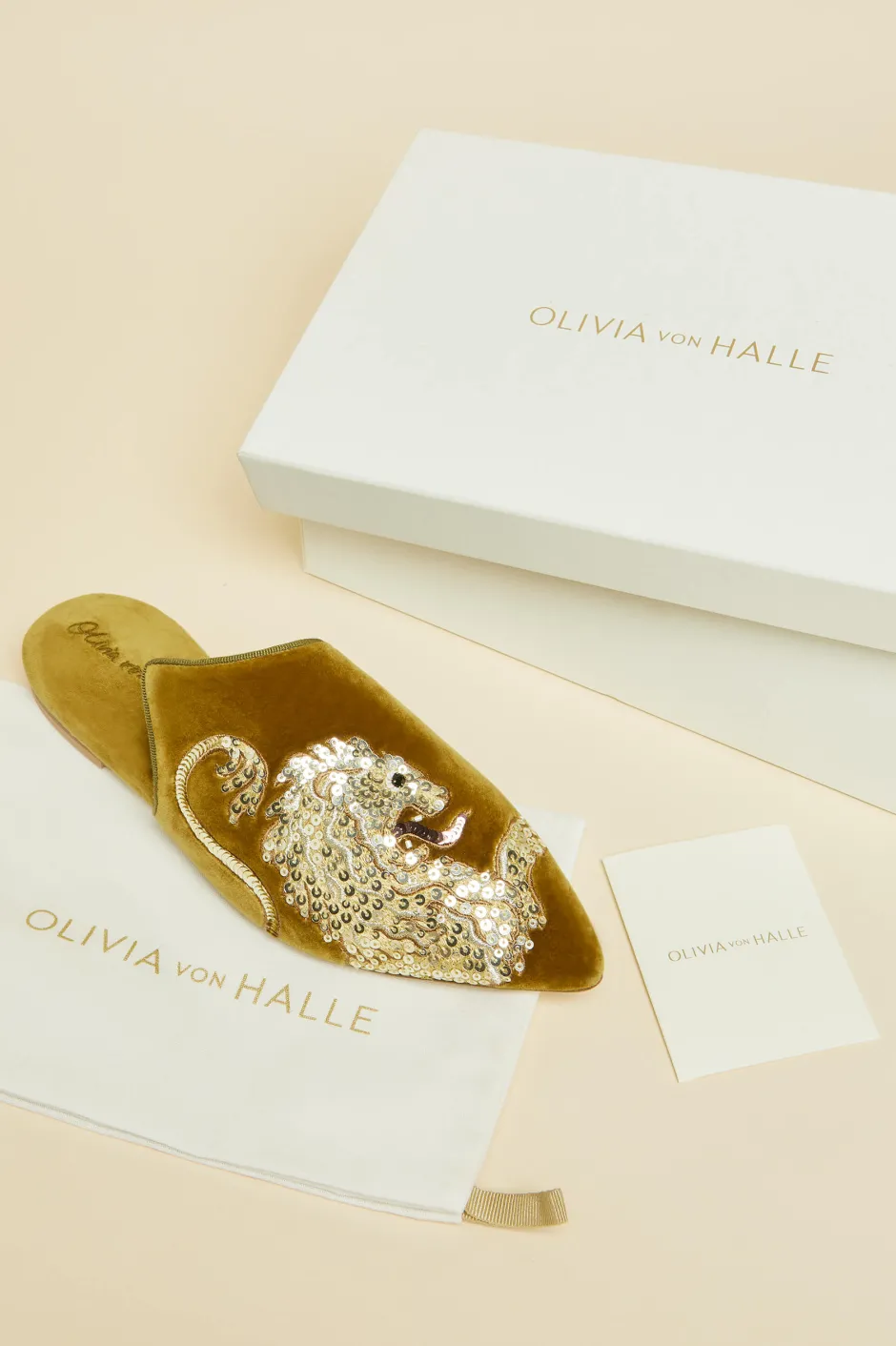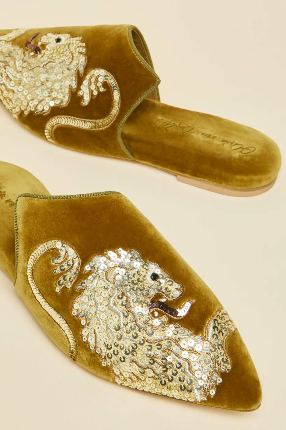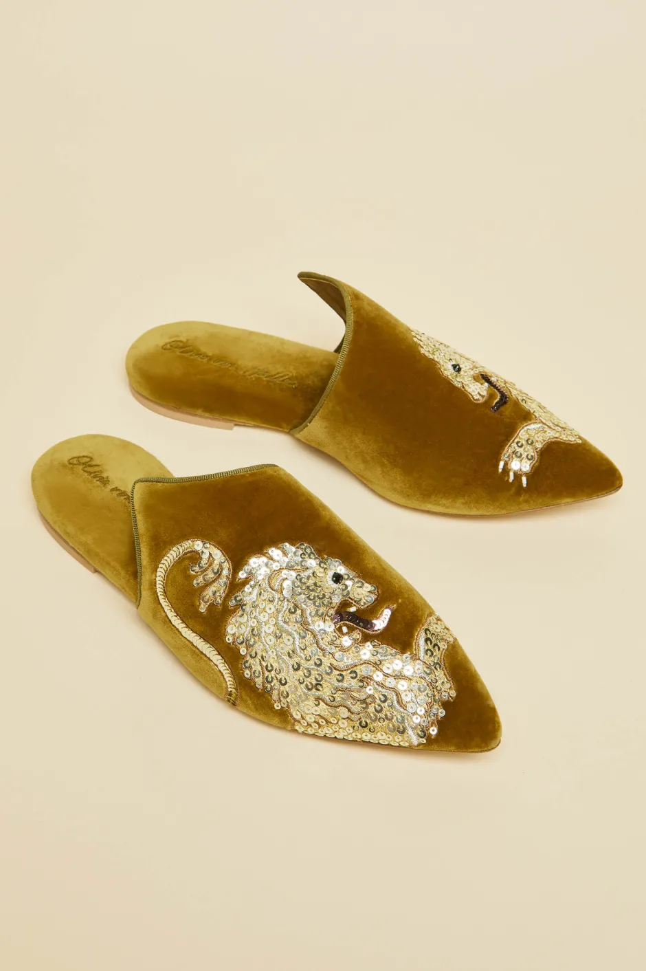 Our enchanting Contessa slippers elevate at-home lounging into a fine art. Crafted from shimmering gold silk velvet and hand-embellished by artisans in India, these sumptuous slippers will make you feel majestic from head to toe. Featuring a heraldic lion motif picked out in sequins and embroidery, these are slippers made to treasure forever.