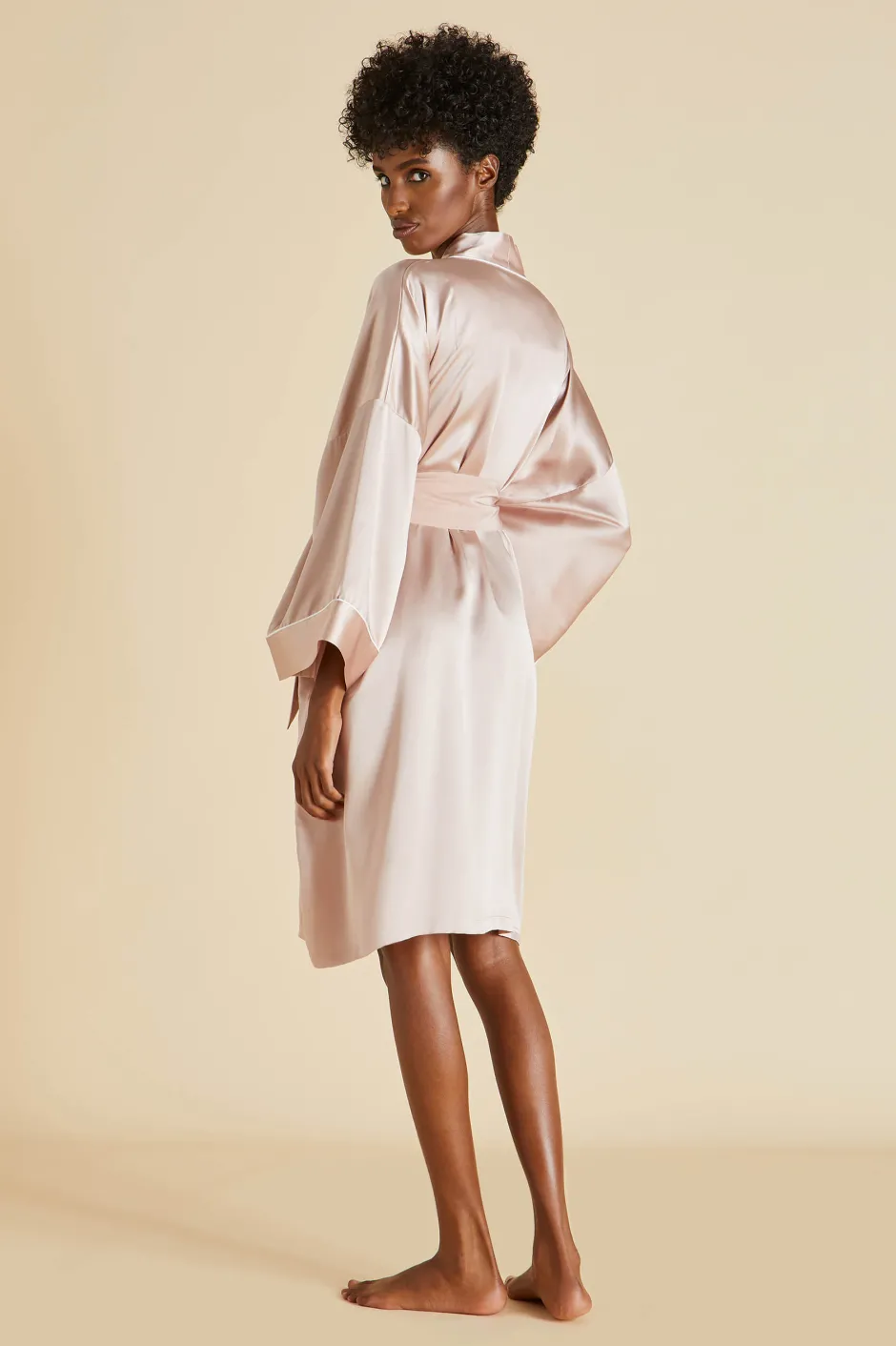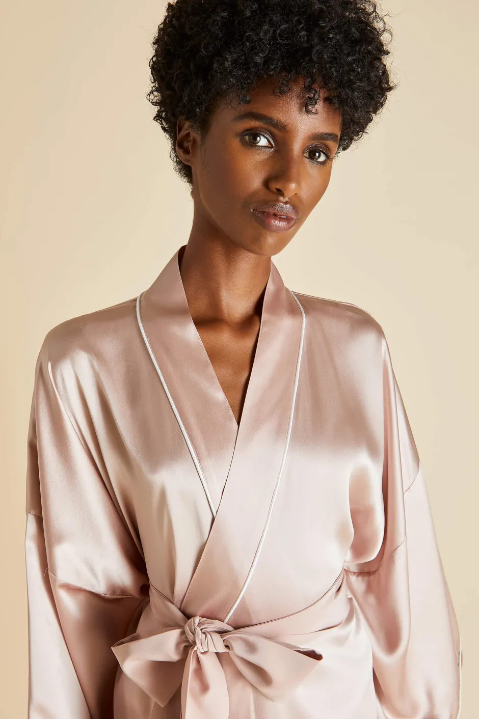 Elegant and expressive, the Mimi is our silk kimono-style robe. Allowing for all-day luxury lounging, this silk kimono-style robe has all our chic, luxe touches; ivory piped silk trims, and oyster pink matte silk sash, and a wide kimono-style sleeve. It’s the perfect bridal party attire; pair with the Bella Oyster or Eye Mask Oyster for all-out luxury.