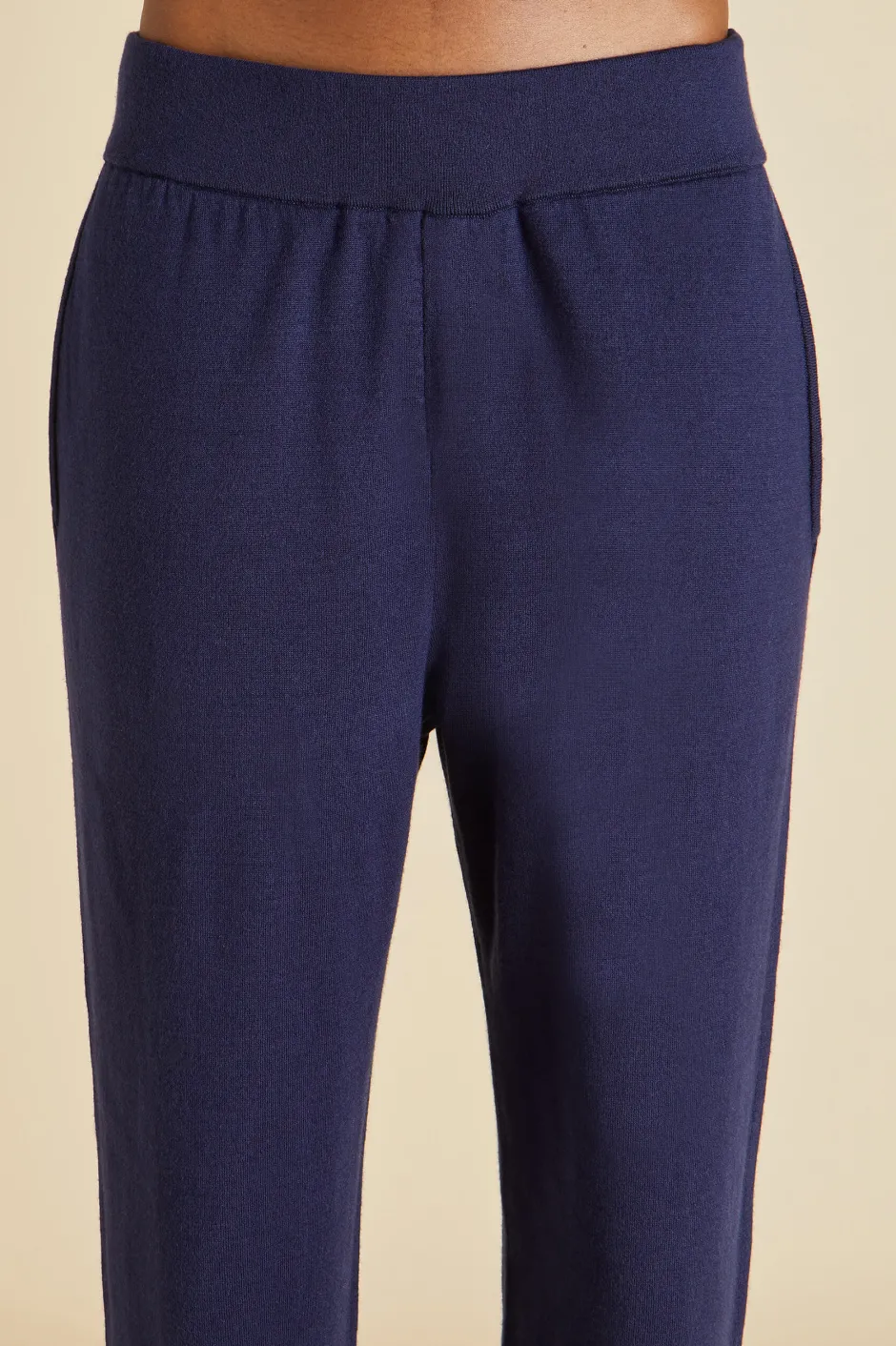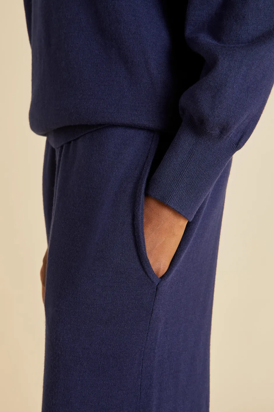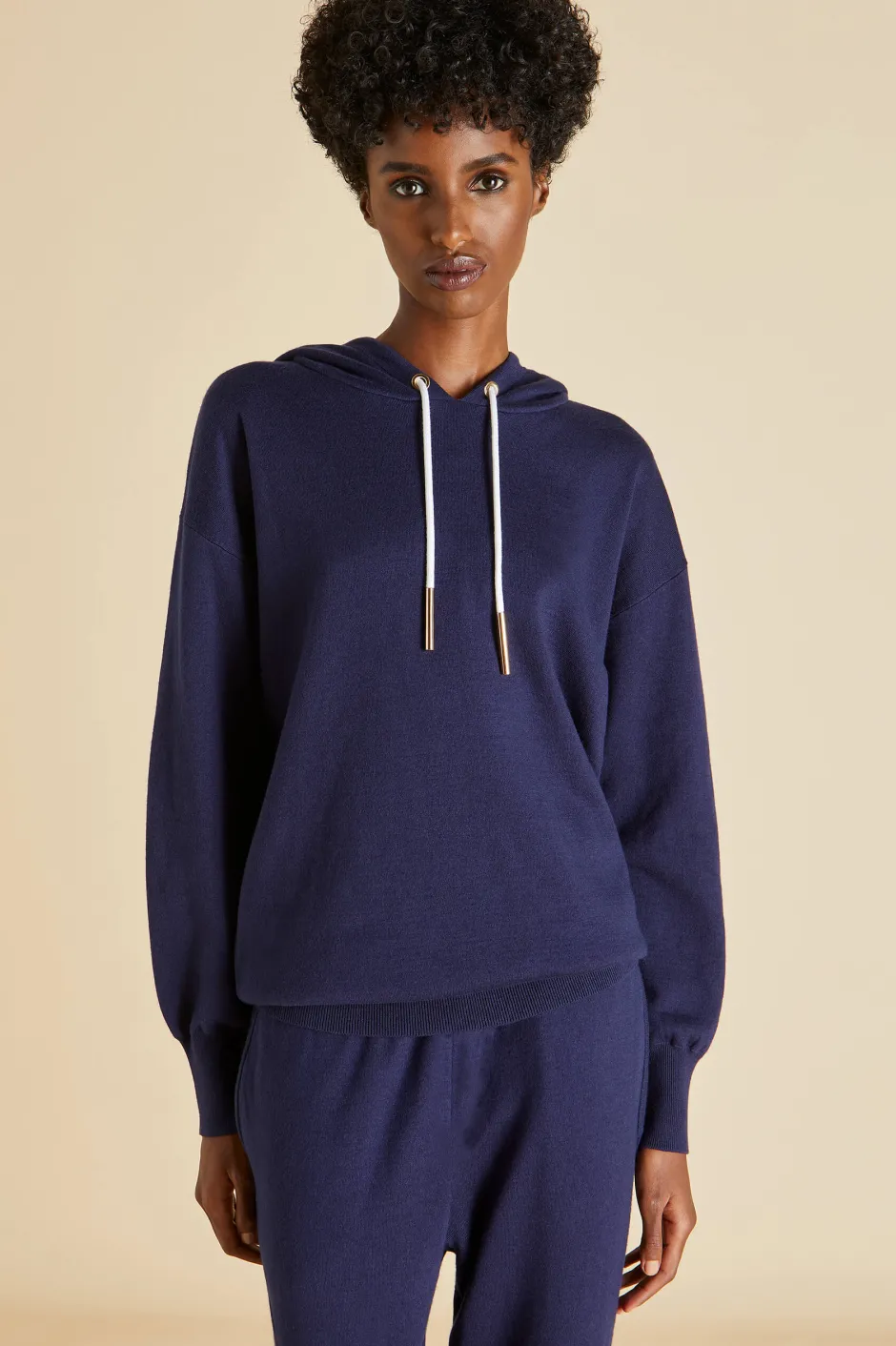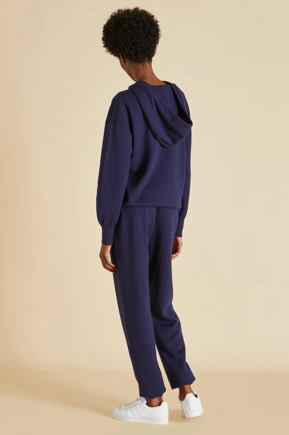 Introducing our Gia tracksuit, the ultimate chic travel piece crafted from the softest pure silk-cashmere blend in classic navy. The Gia Paris is cut in a slim silhouette with a generous hood and luxe gold draw cord details. This is the ultimate in luxury loungewear. This style and silhouette is suited to all, and does not adhere to gender boundaries.