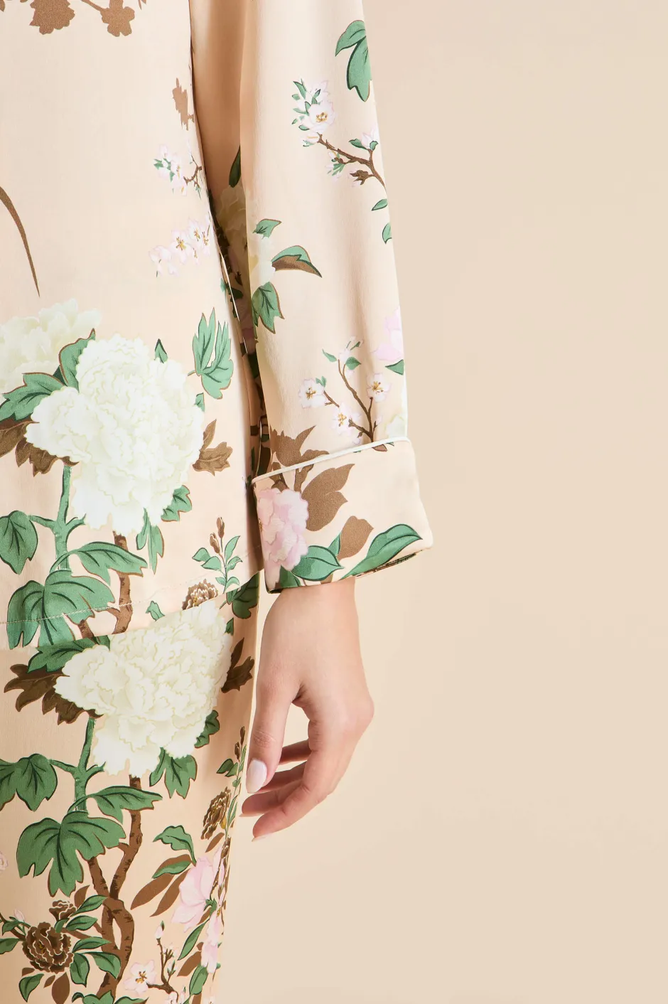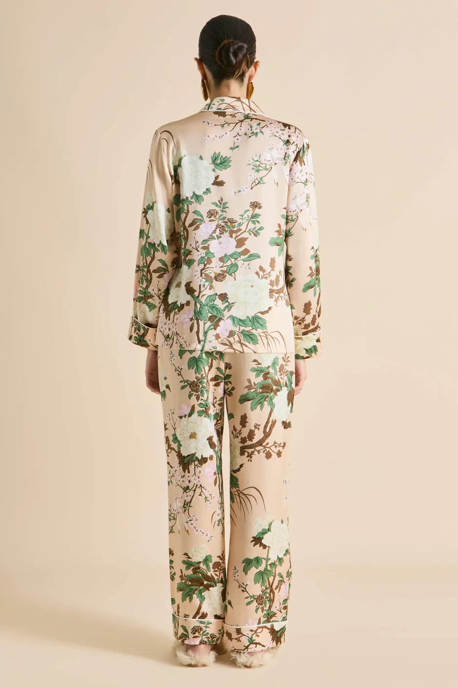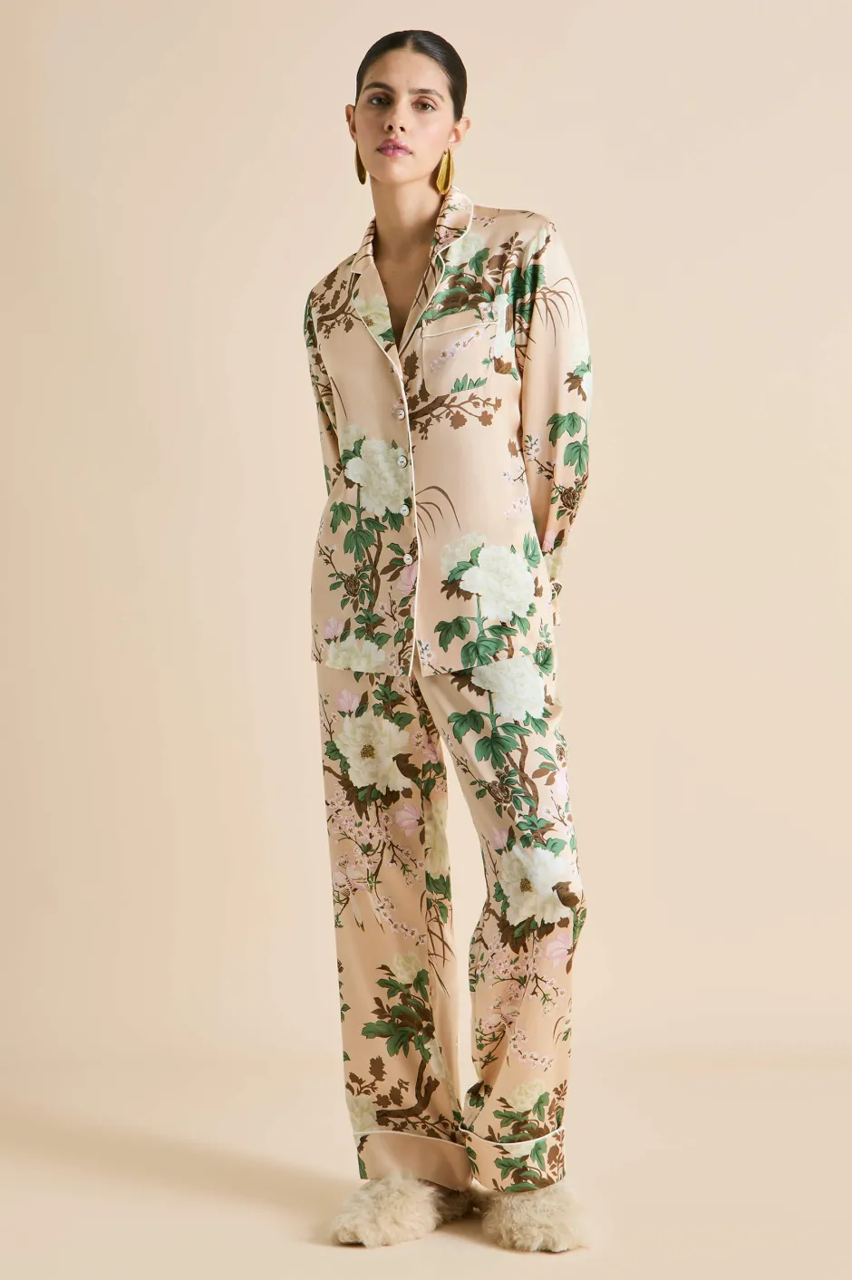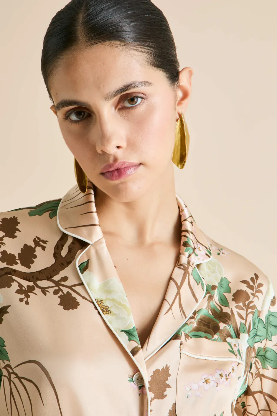 Lila Tirtoff pajamas reinterprets spellbinding stage and costume designs from the art deco period for the modern era. She’s as luxurious as is to be expected, fashioned from none other than our cream floral 19-momme silk, and is at her most captivating when rounded out with her matching Capability robe and Audrey eye mask