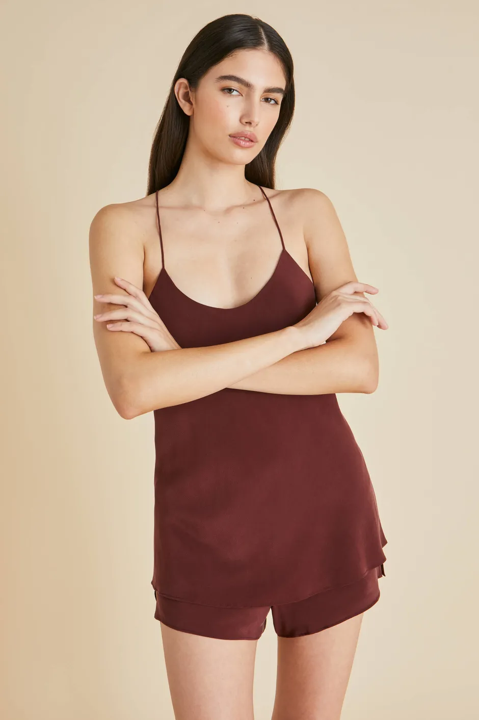 Find a sophisticated splendour in our Bella bias-cut camisole and French knicker set. Crafted from luxurious burgundy 16-momme silk crêpe de chine, this cult-favourite set offers a subtle lesson in elegance without stinting on the romance. Paired with our Audrey Aphrodite eye mask, it’ll be love at first sight.