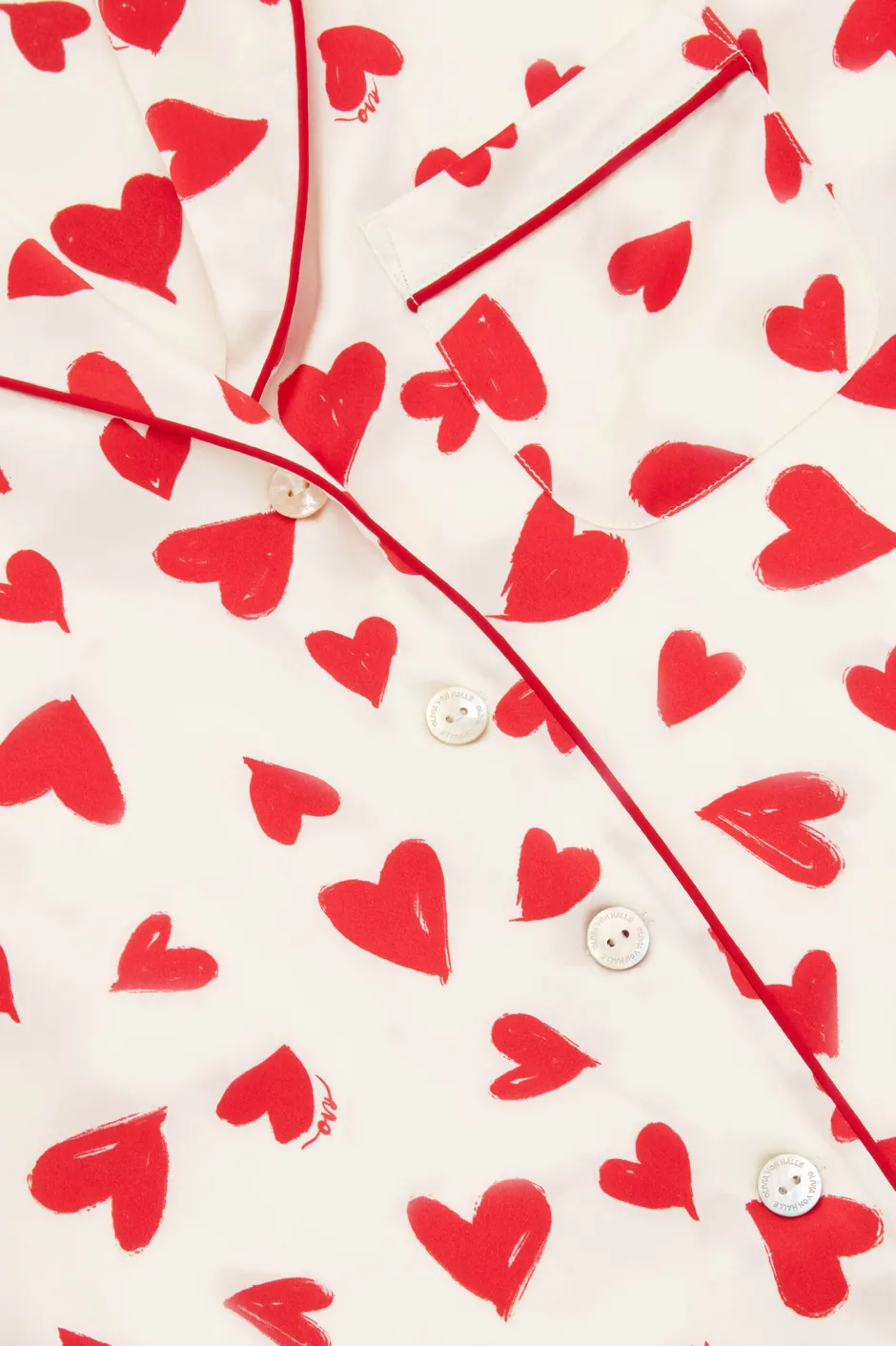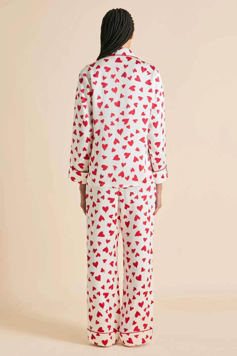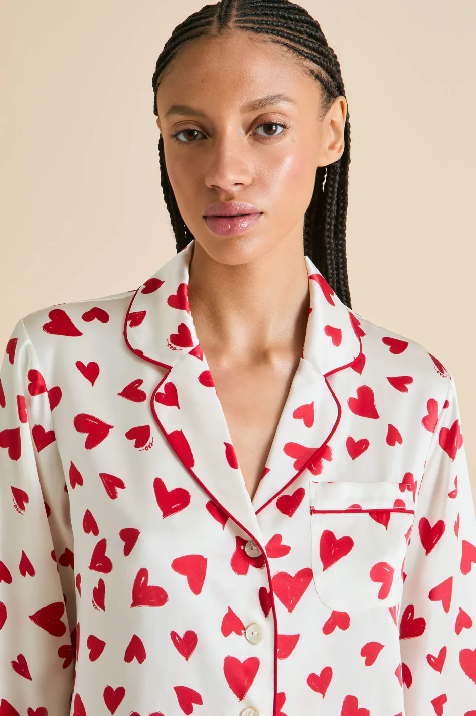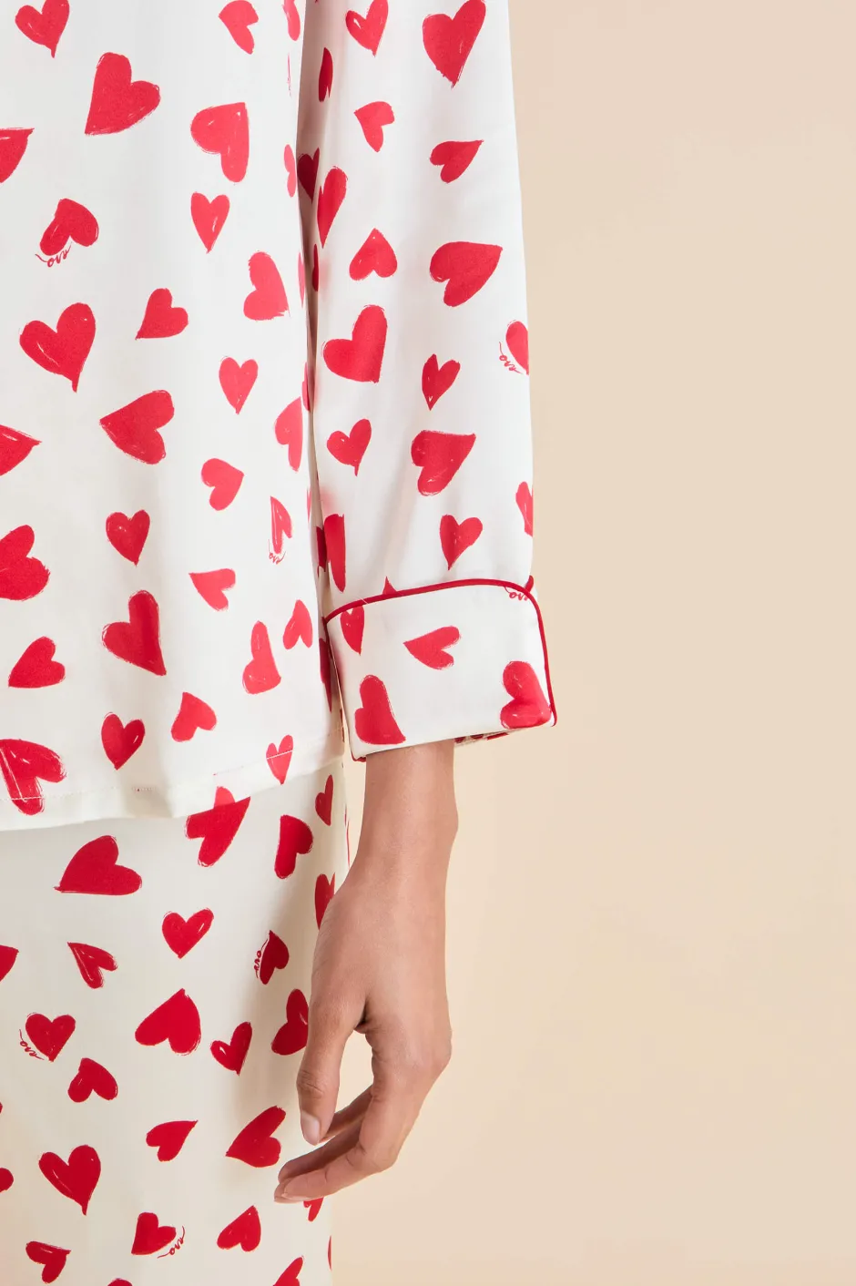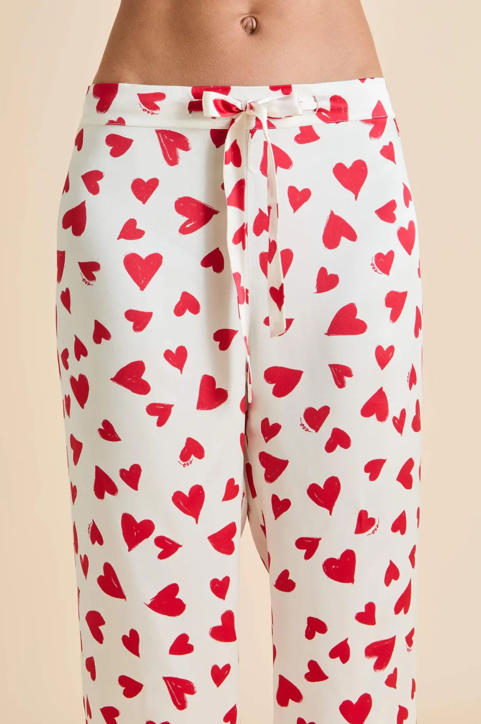 The Lila silhouette is an Olivia von Halle staple, our first and bestselling silhouette that’s beloved by style icons the world over. Never one to take herself too seriously, this season she finds her nightshirt and trousers adorned with hand-painted love hearts that infuse her sophisticated 19-momme silk with a splash of whimsy.