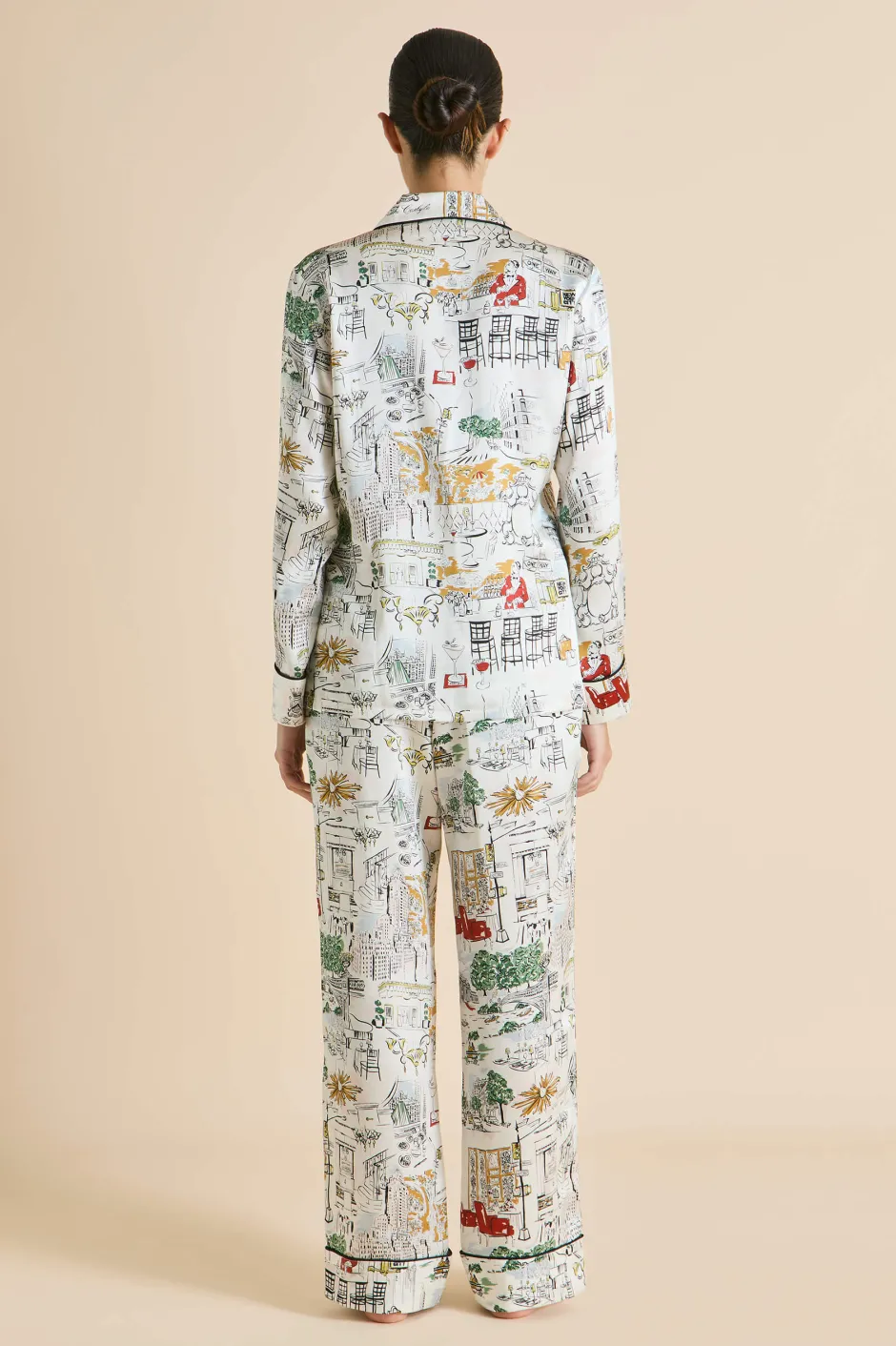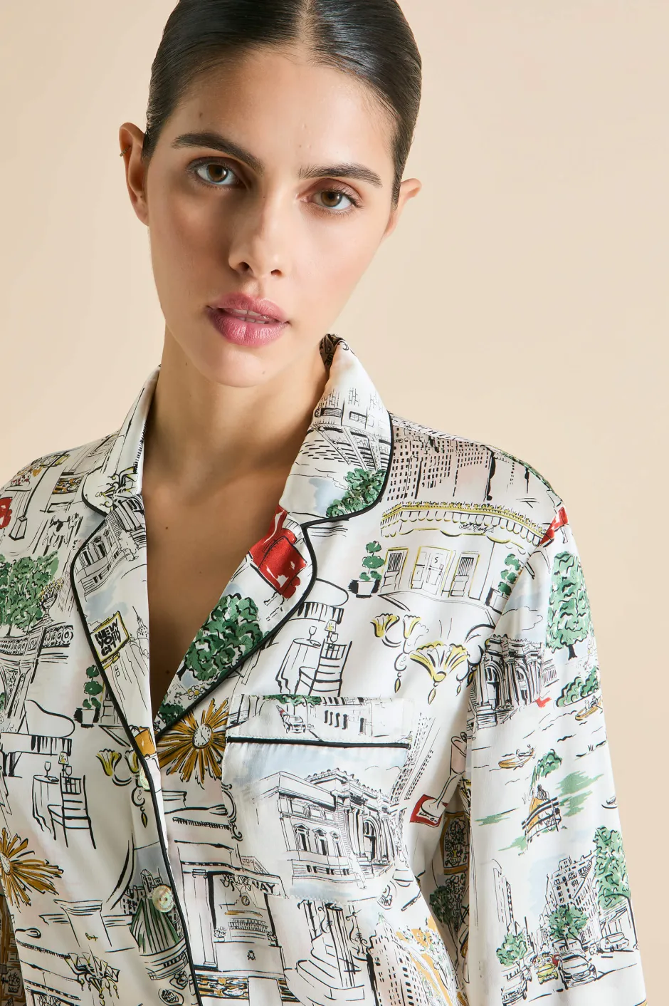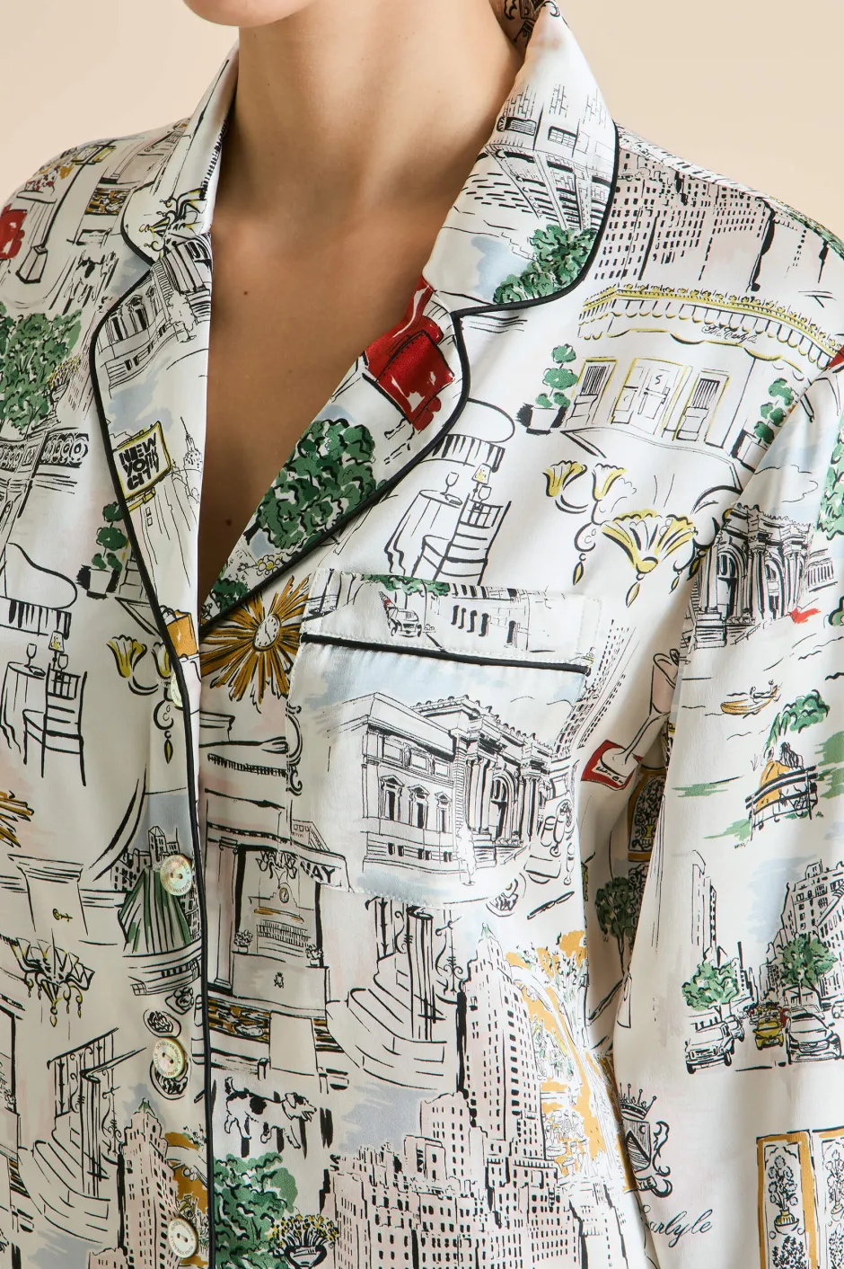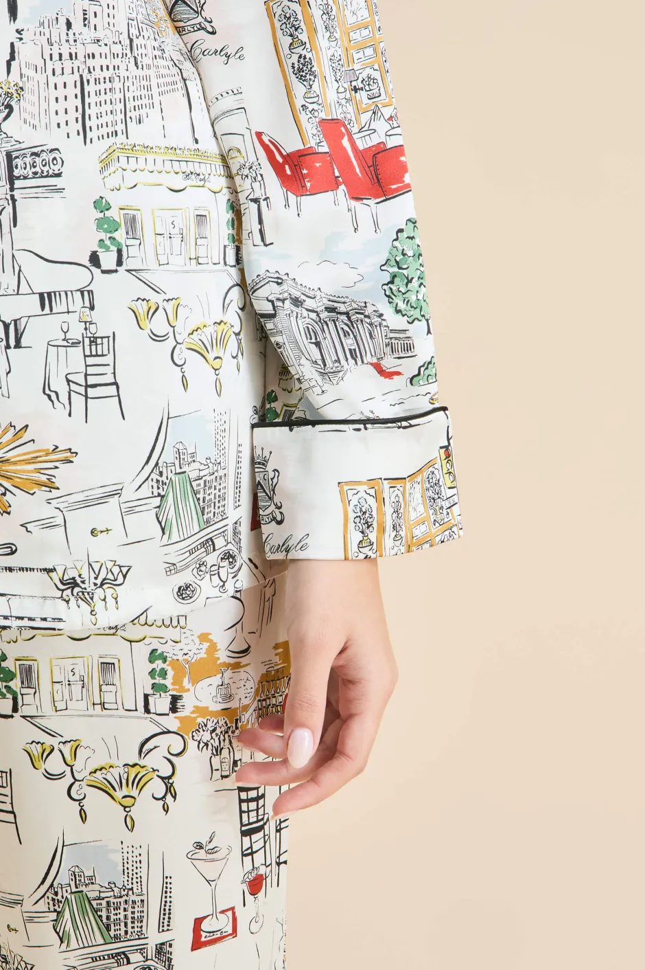 Olivia von Halle has partnered with The Carlyle, A Rosewood Hotel—an iconic cultural landmark on New York City’s Upper East Side—to create a limited edition lounging pajama that pays homage to the hotel and the city that never sleeps. The bespoke Carlyle print captures the hotel’s charm and storied past, featuring classic New York moments, drawing inspiration from the vibrant array of sights and scenes that define the hotel and its surroundings. Screen-printed on the world’s finest 19-momme silk, the pajama comes in our signature Lila silhouette.