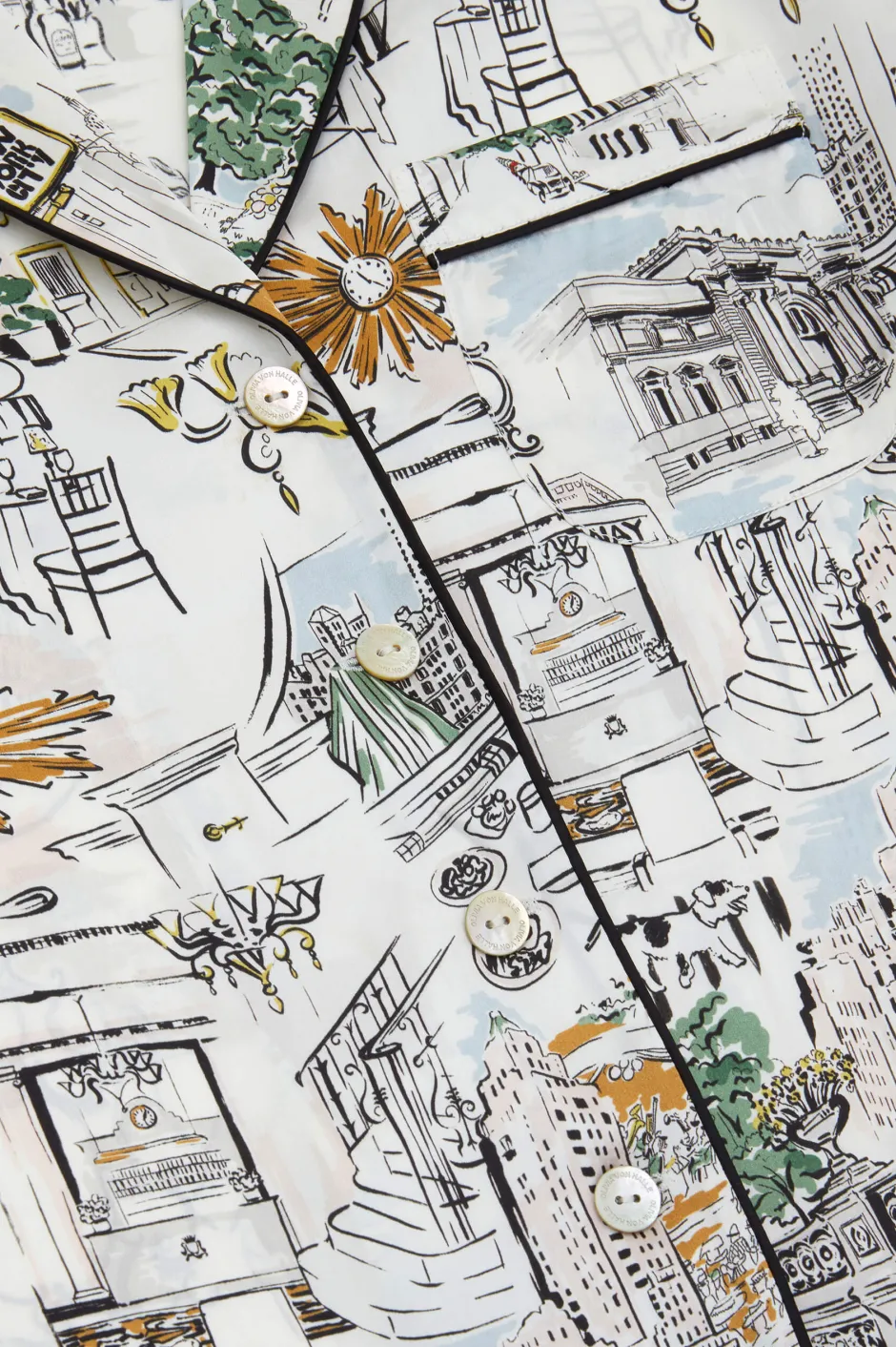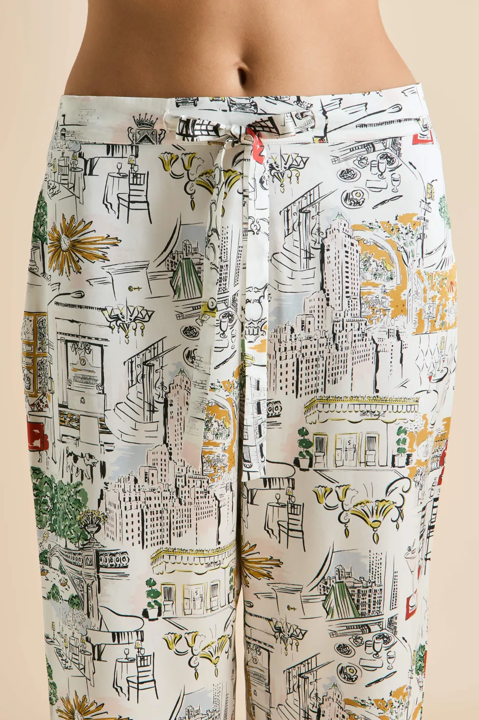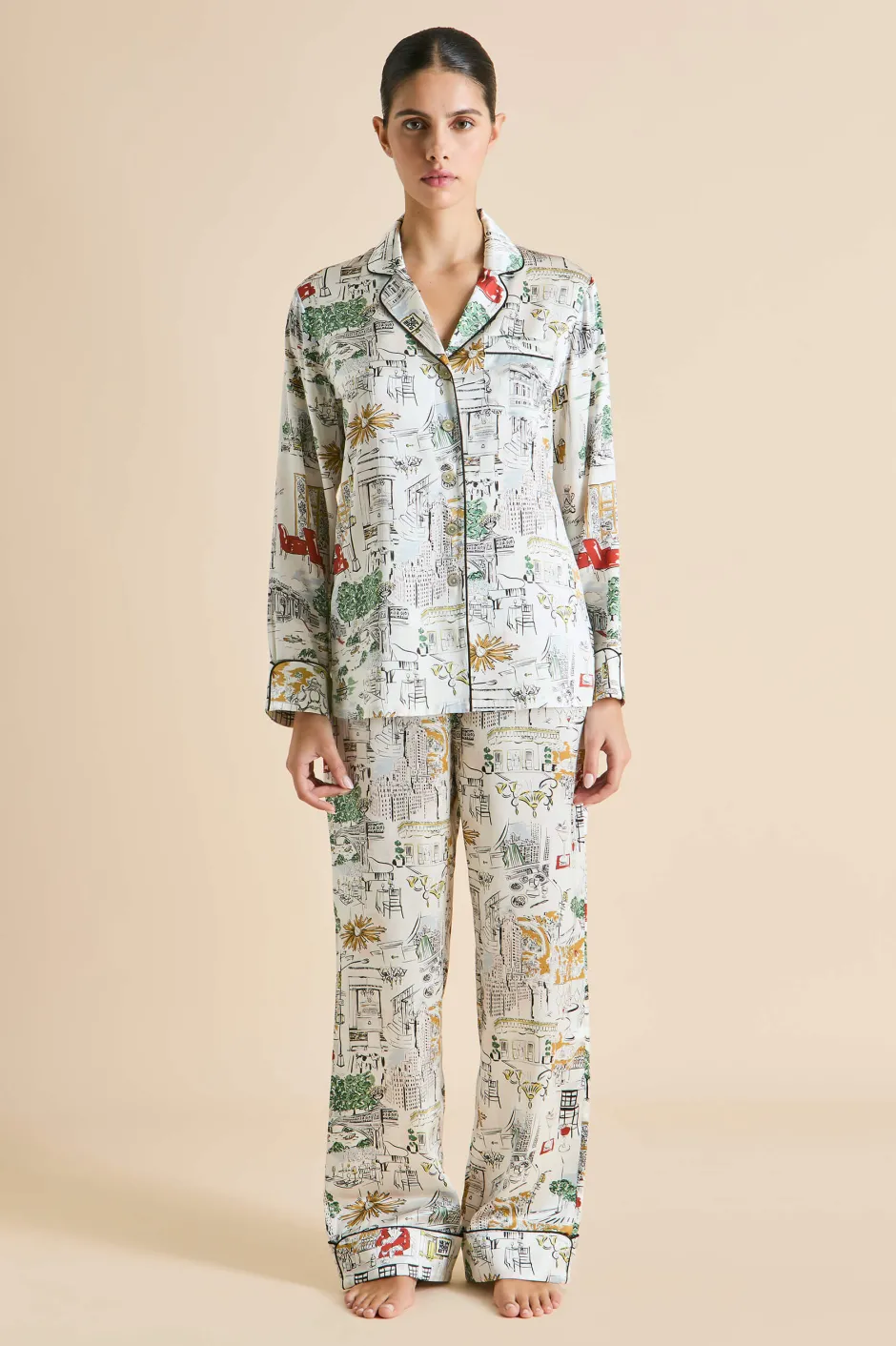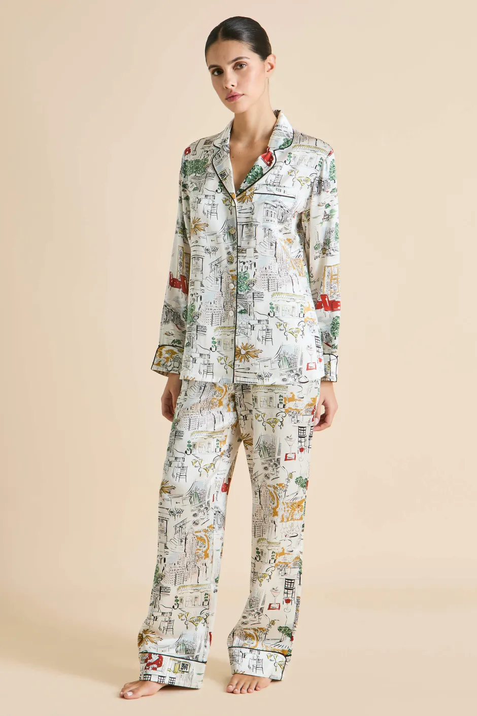 Olivia von Halle has partnered with The Carlyle, A Rosewood Hotel—an iconic cultural landmark on New York City’s Upper East Side—to create a limited edition lounging pajama that pays homage to the hotel and the city that never sleeps. The bespoke Carlyle print captures the hotel’s charm and storied past, featuring classic New York moments, drawing inspiration from the vibrant array of sights and scenes that define the hotel and its surroundings. Screen-printed on the world’s finest 19-momme silk, the pajama comes in our signature Lila silhouette.