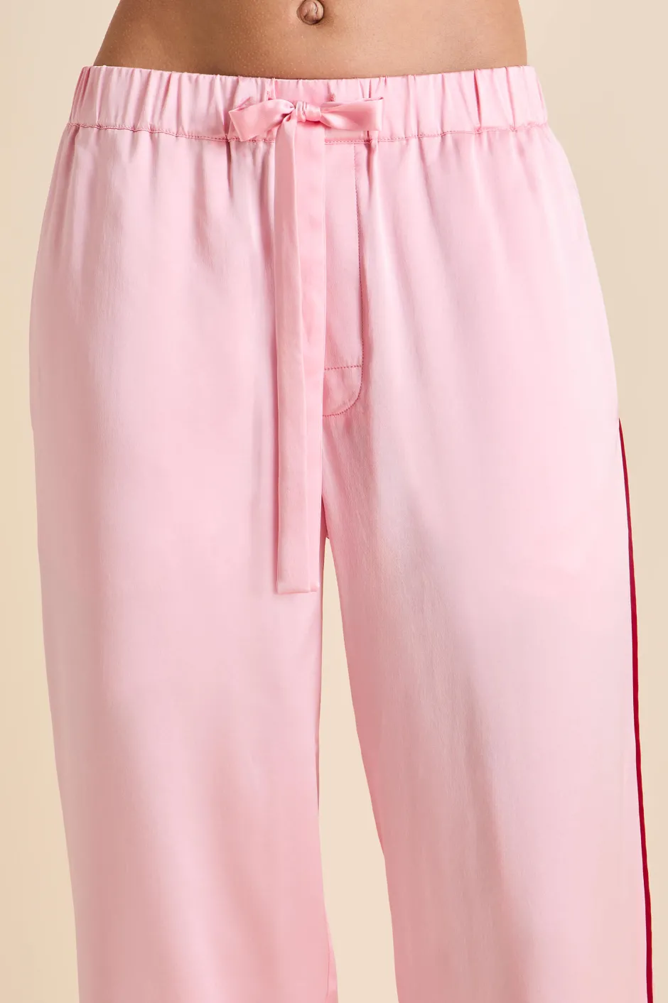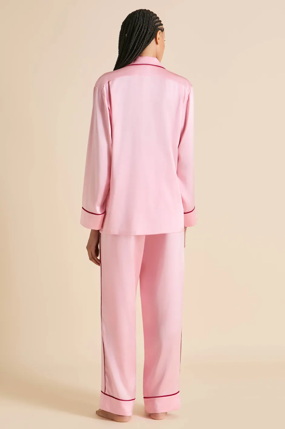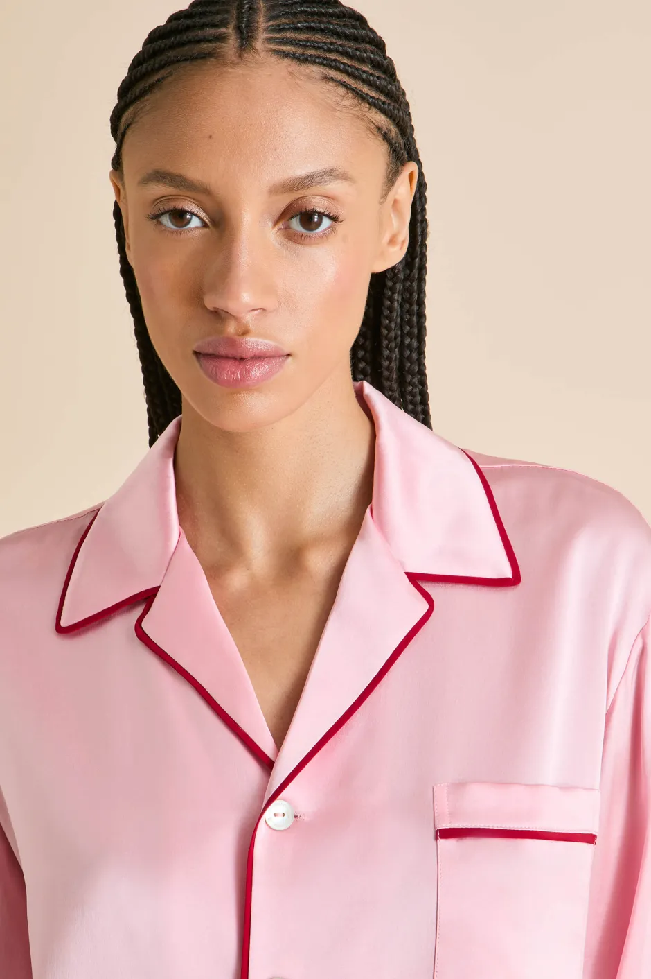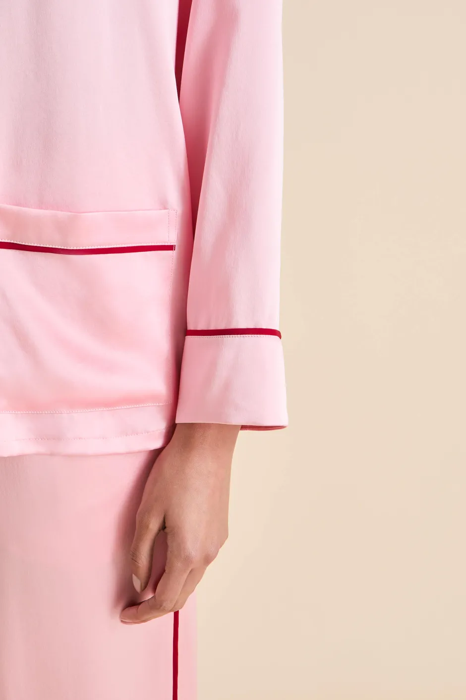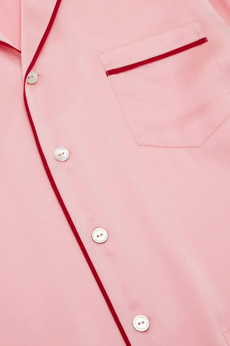 Our laidback Yves silhouette shape shifts once more this season, arriving in the form of the romantic Yves Blush Pink. Comprised of a breezy nightshirt and relaxed trousers, she’s crafted from a soft-pink 19-momme silk, topped off with contrasting red piped trims and looks especially enthralling alongside her matching Audrey eye mask.